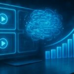 Futuristic digital dashboard displaying video SEO metrics like views and watch time on glowing screens, with a central thumbnail and dynamic graphs.